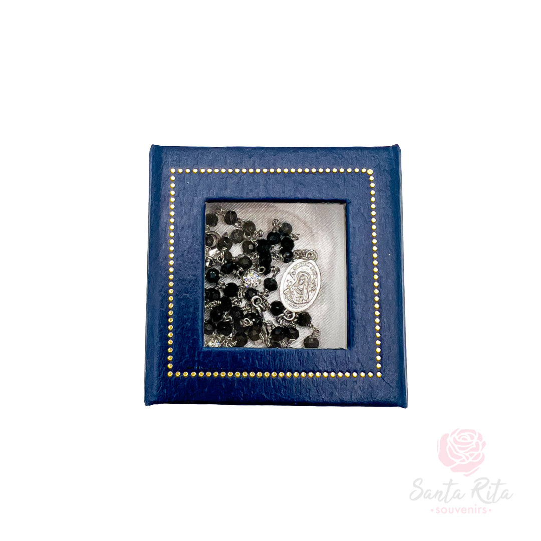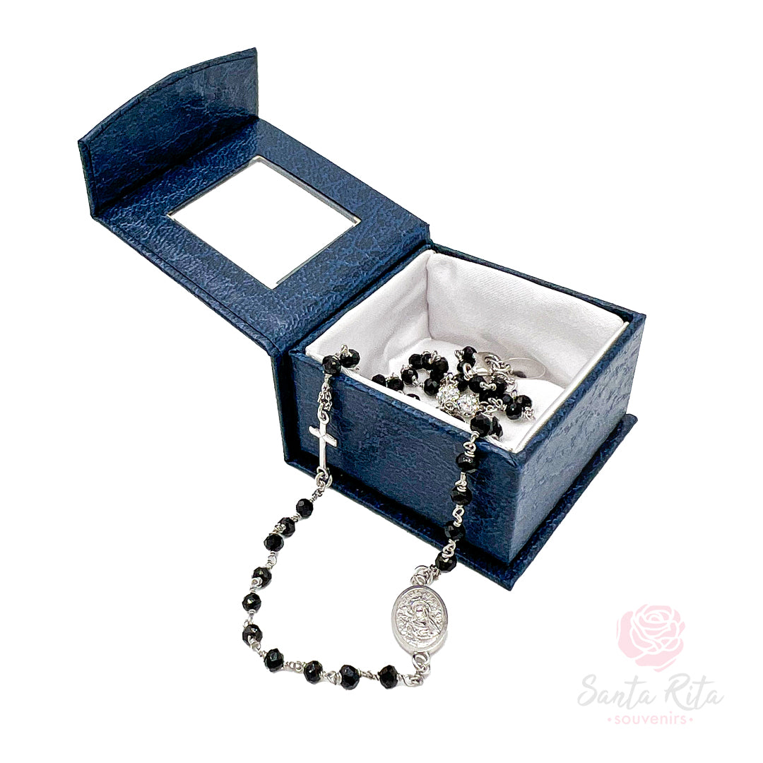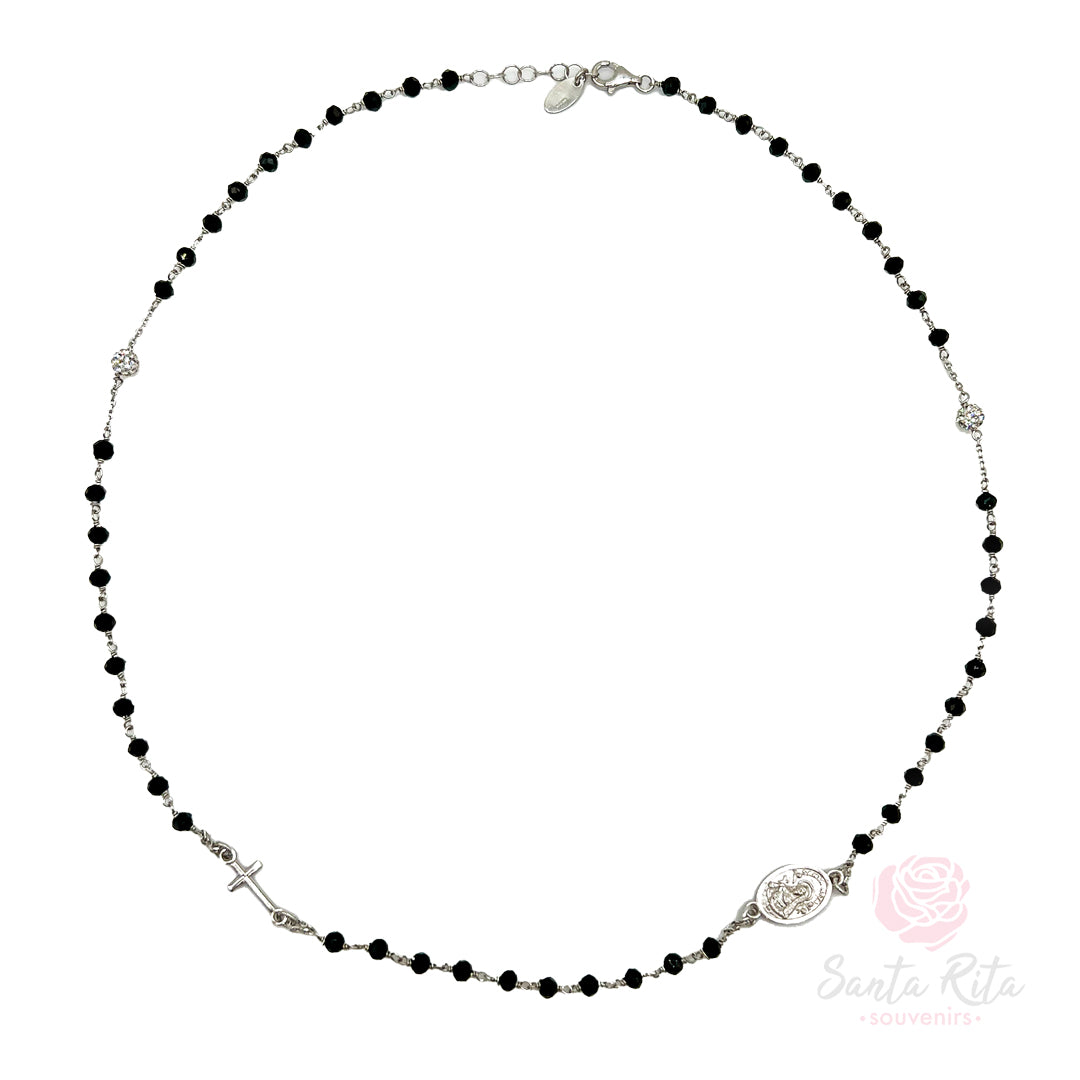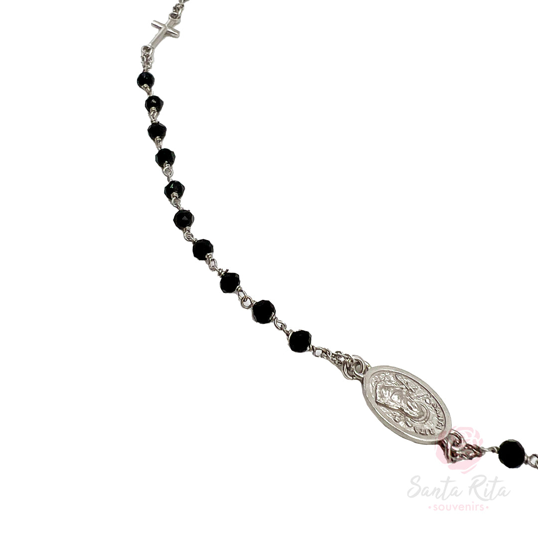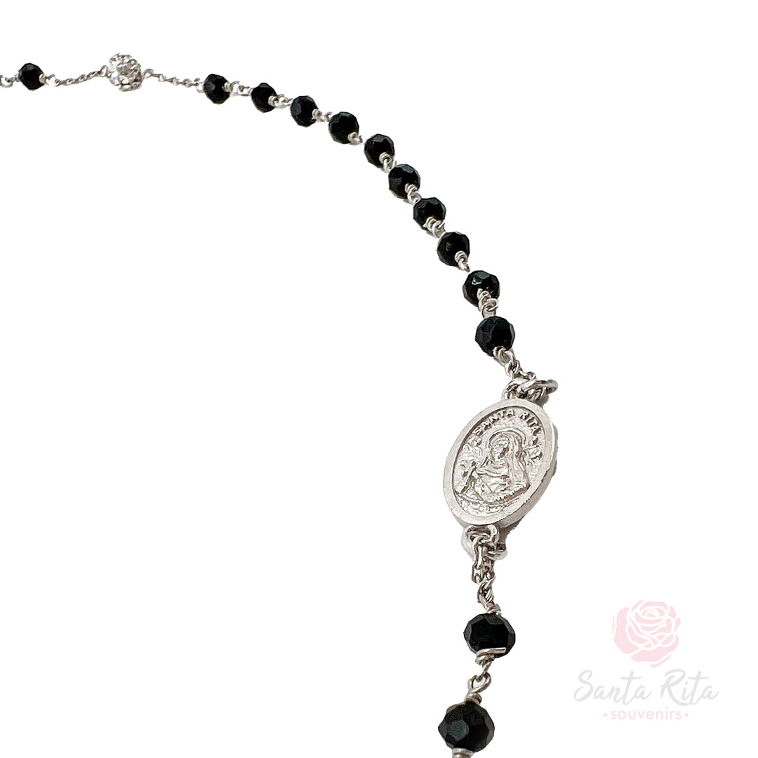 ✨ Materiali e dettagli artigianali Struttura in argento 925 certificato, lavorato con cura. Grani in cristallo Swarovski® nero, sfaccettati e luminosi. Medaglia ovale raffigurante Santa Rita con la croce tra le mani. Croce terminale sobria, in stile moderno ed elegante. Realizzato con passione e maestria da artigiani italiani.