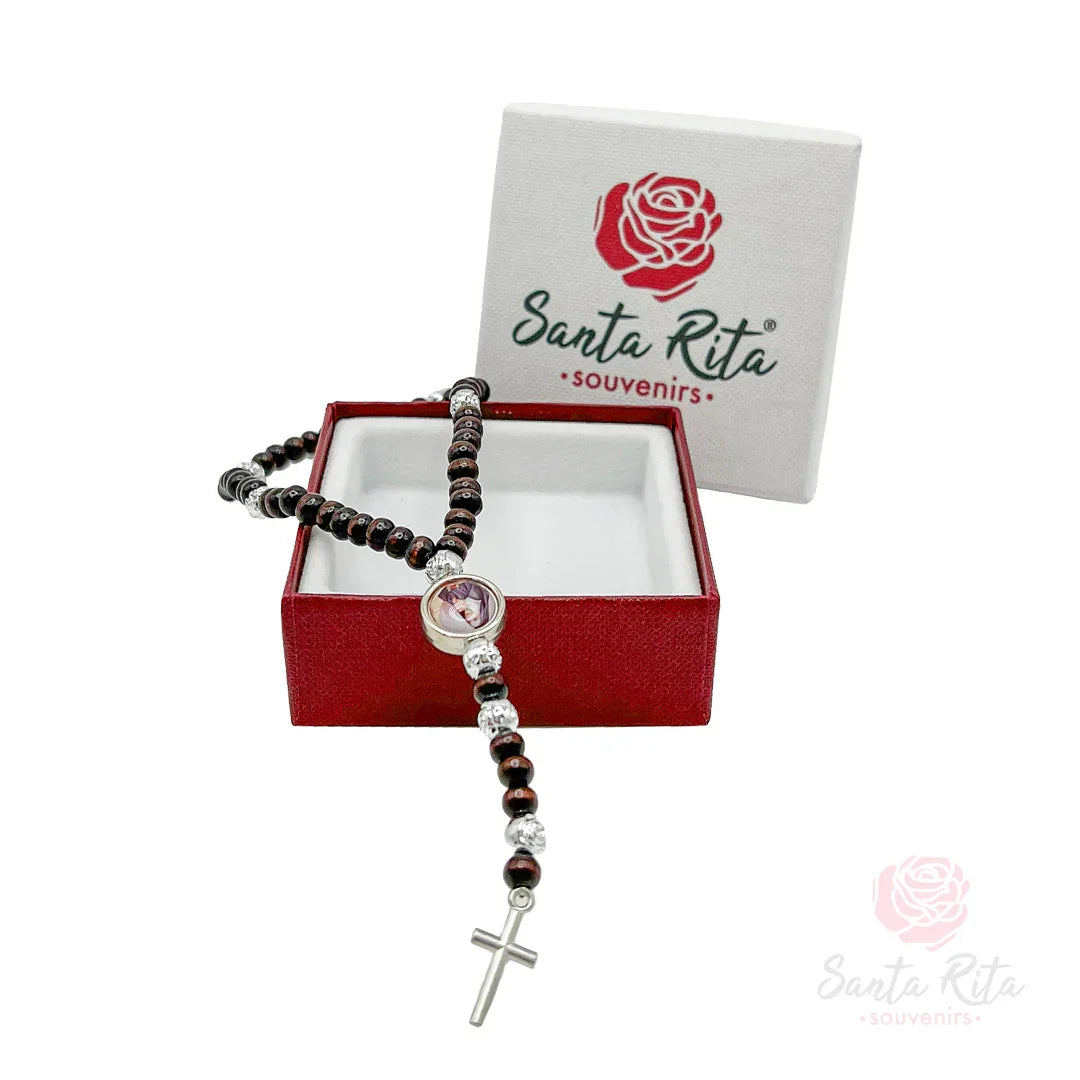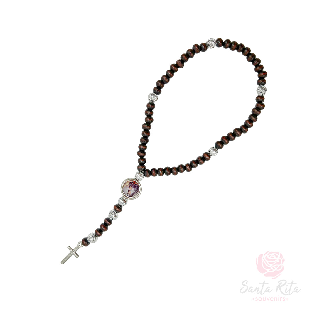Questo rosario per auto è realizzato con grani in legno scuro naturale, impreziositi da inserti metallici e da una crociera centrale raffigurante l’immagine di Santa Rita da Cascia. Il design è compatto e funzionale, ideale da appendere allo specchietto retrovisore come simbolo di protezione e affidamento durante la guida.