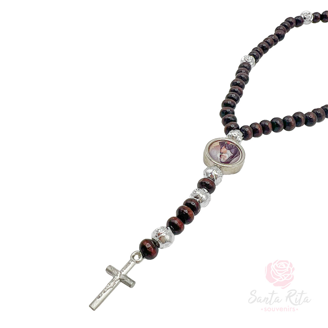 I grani, in legno levigato e lucidato, si alternano a elementi decorativi argentati che donano ritmo e luminosità al rosario. Al centro, la medaglietta raffigura Santa Rita con il volto sereno e ispirato, circondata da una cornice in metallo lavorato. Il crocifisso finale è piccolo ma ben definito, pensato per un uso pratico senza rinunciare al significato devozionale.