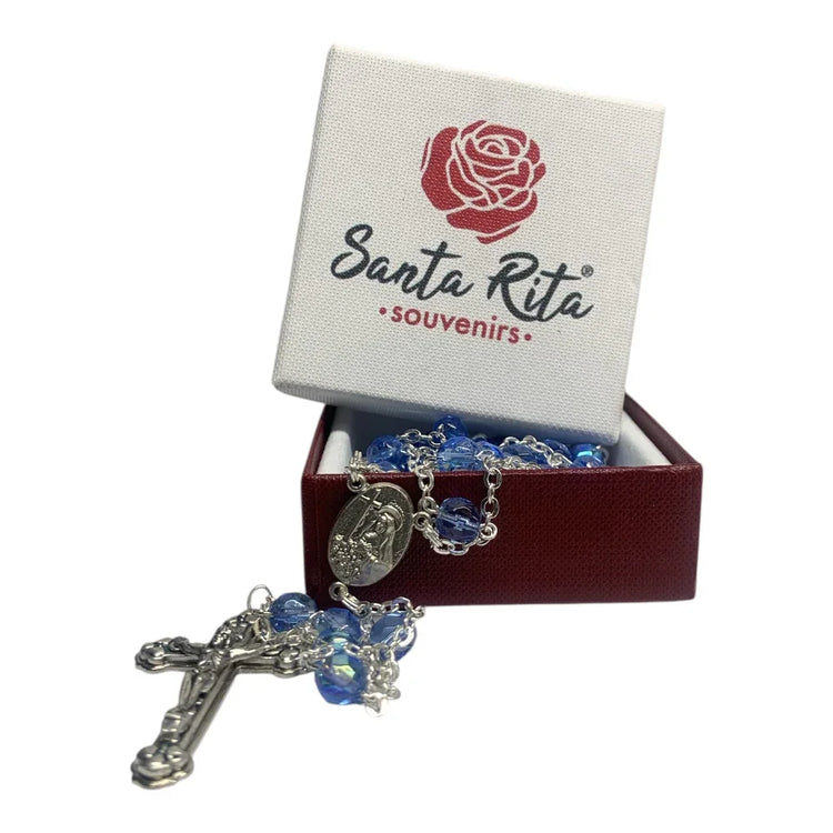 La struttura particolare di questo rosario, con la sua disposizione simbolica, lo rende perfetto per la meditazione profonda e la preghiera contemplativa. I grani in cristallo riflettono la luce creando un'atmosfera spirituale unica, mentre la medaglietta di Santa Rita e il crocifisso finemente lavorati completano questo oggetto devozionale di grande valore simbolico e spirituale.