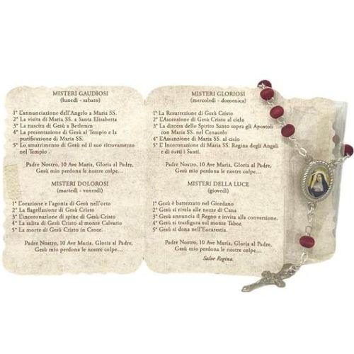 Stampato su carta effetto pergamena, questo libretto contiene tutti i Misteri del Rosario da recitare, giorno per giorno, con testi chiari e leggibili. Completa il set una decina in grani profumati, con medaglietta centrale di Santa Rita e crociera finale. Una proposta devozionale elegante e leggera, ideale da portare sempre con sé nella borsa, nel portafoglio o nel libro di preghiera.