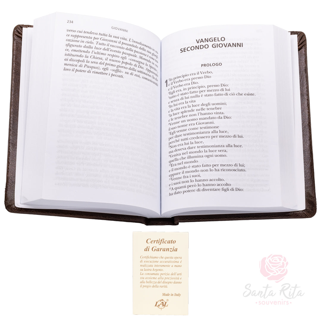 Pregiato vangelo tascabile con copertina in pelle naturale di alta qualità, impreziosito da una raffinata lamina in argento realizzata a mano su lastra d'argento. Un capolavoro di artigianalità italiana che unisce spiritualità, arte sacra e tradizione orafa in un oggetto devozionale unico.