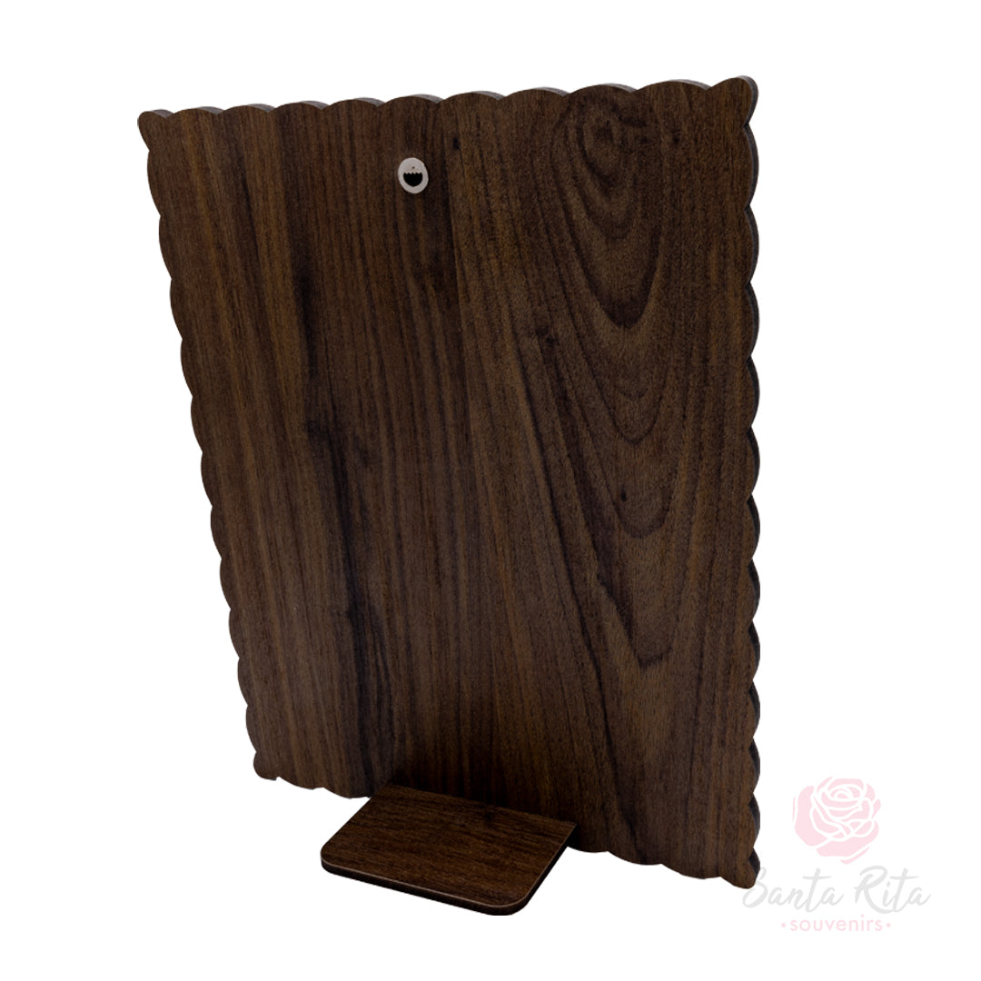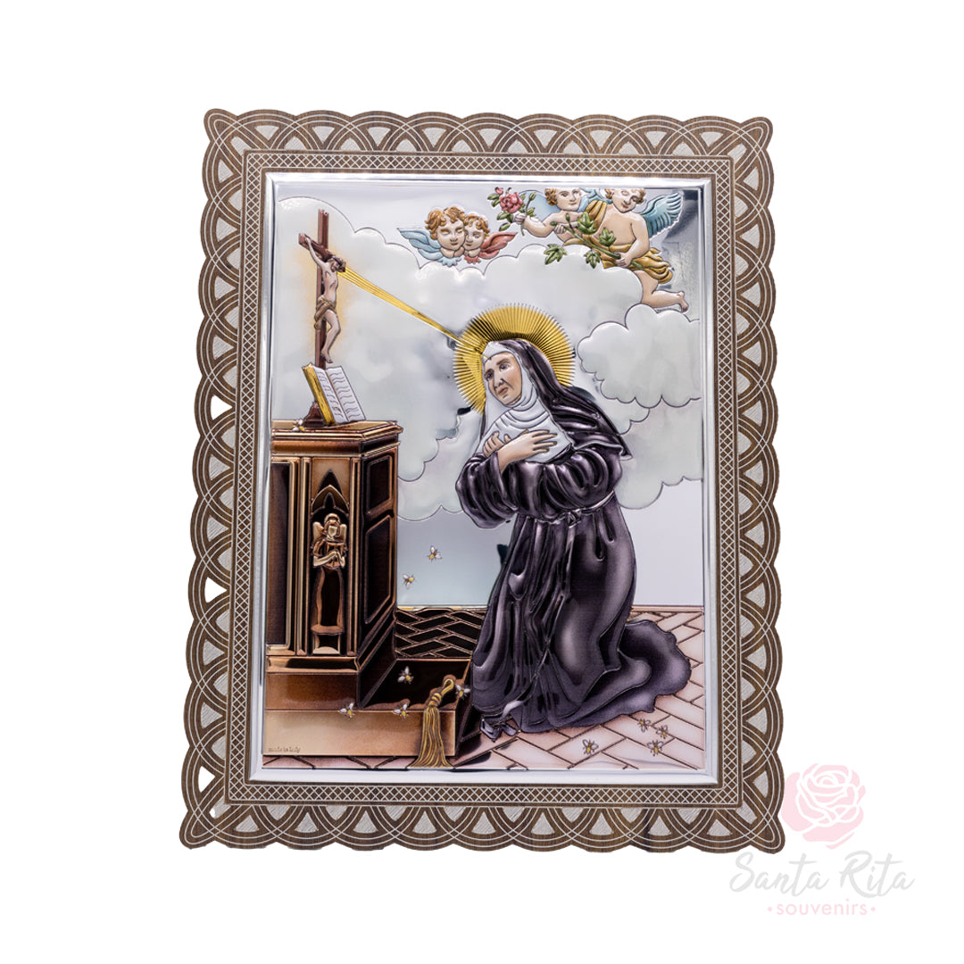 Questo quadro religioso, realizzato in bilaminato e interamente prodotto in Italia, raffigura uno degli episodi più mistici della vita di Santa Rita da Cascia: la ricezione della spina mentre prega davanti al crocifisso. Una scena di grande forza spirituale, racchiusa in una cornice finemente lavorata, pensata per ispirare raccoglimento e protezione in ogni ambiente.