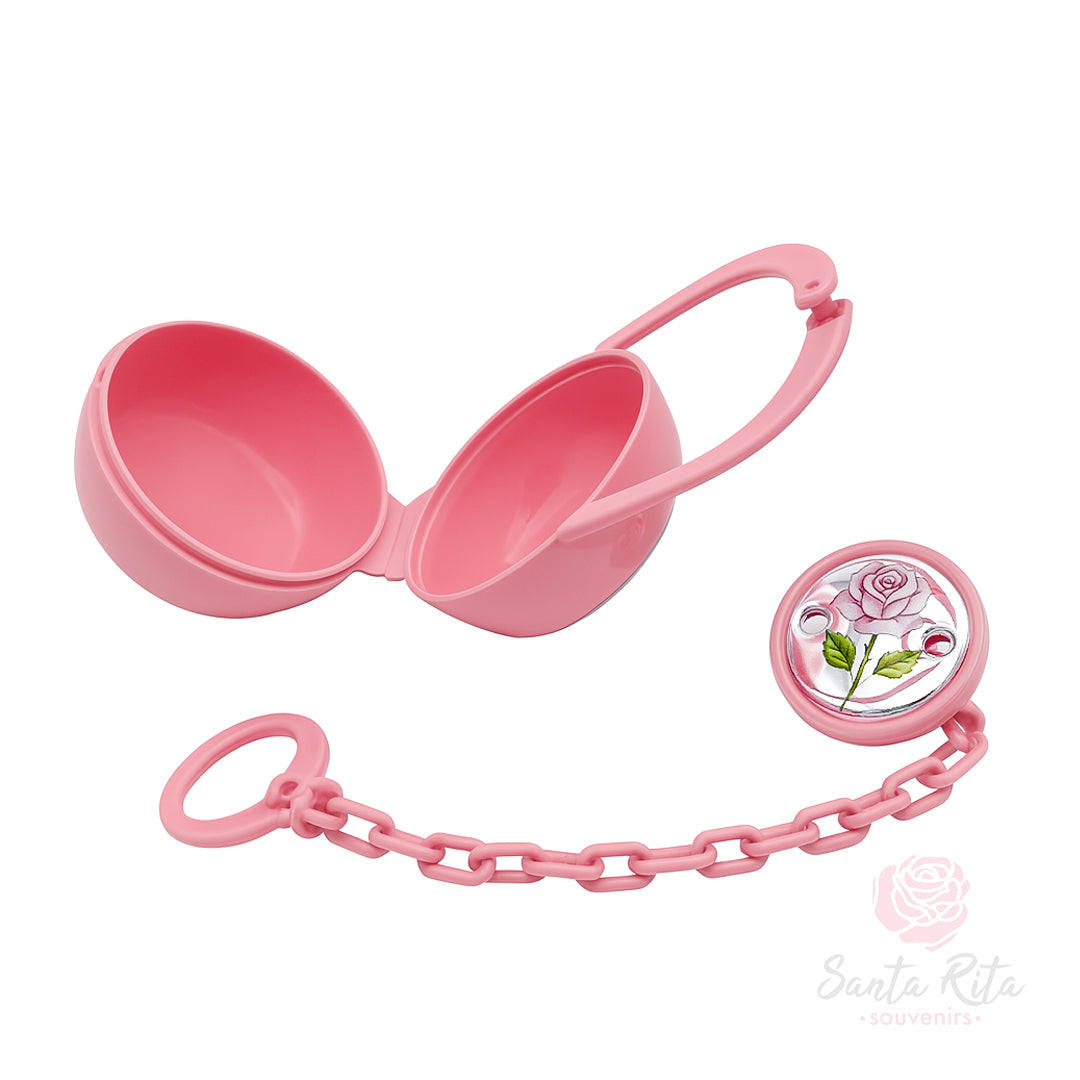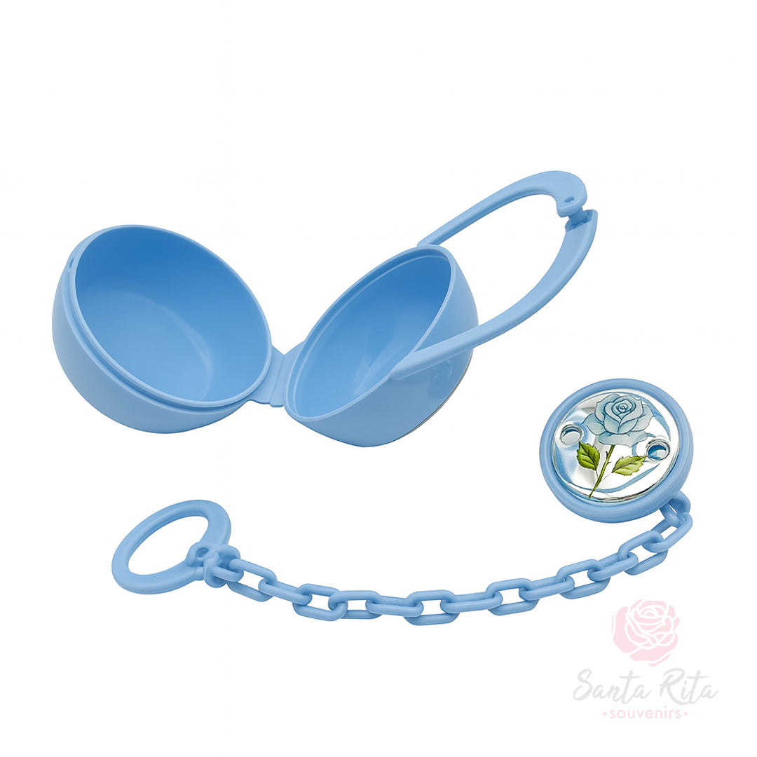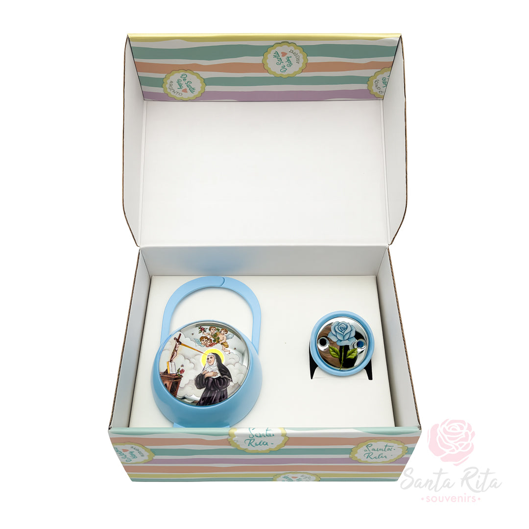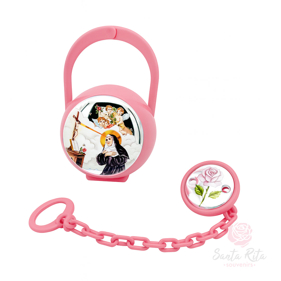 Questo tenero portaciuccio a forma di cuore, con catenella abbinata, è impreziosito da una placca smaltata in laminato raffigurante Santa Rita in preghiera tra angeli e simboli sacri. Realizzato artigianalmente in Italia, ogni dettaglio è smaltato a mano con cura e devozione, rendendo ogni pezzo unico. Il prodotto è disponibile in due delicate varianti: azzurro per bambini e rosa per bambine.