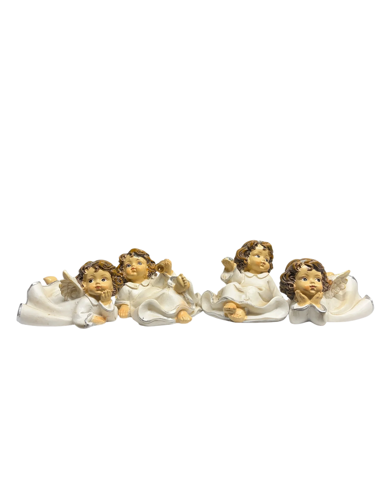 Quattro angioletti sdraiati finemente dipinti a mano, realizzati in resina e curati nei dettagli, perfetti da esporre su mensole, mobili o tavoli. Ogni statuina trasmette un senso di pace e protezione, rendendo questo set una scelta elegante e significativa per chi desidera un elemento decorativo dal forte valore simbolico. Ideali anche come bomboniere per celebrazioni religiose.