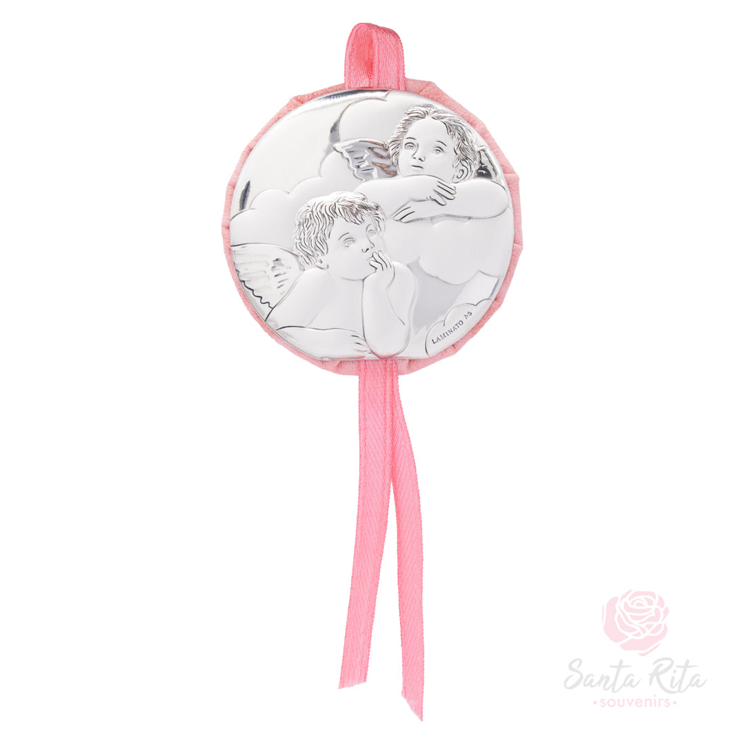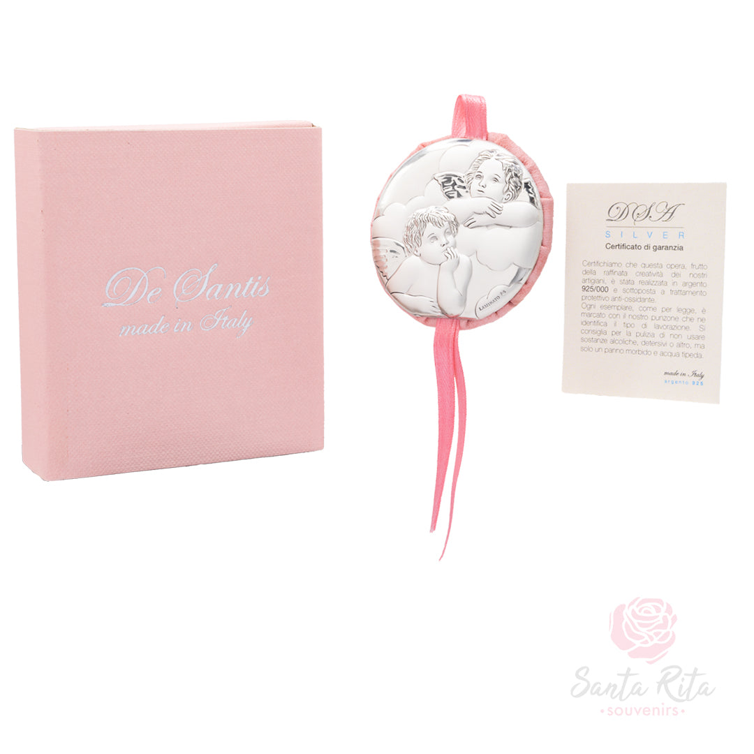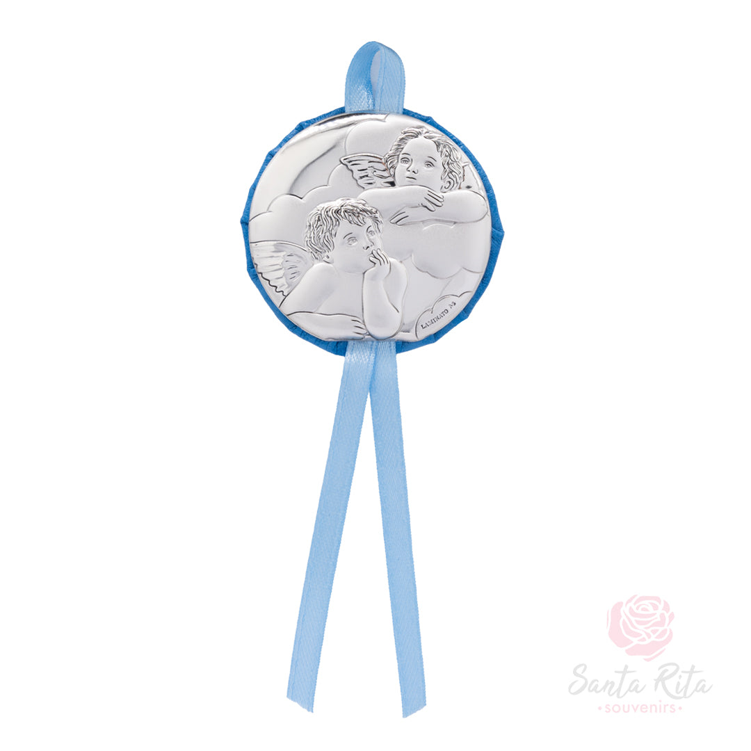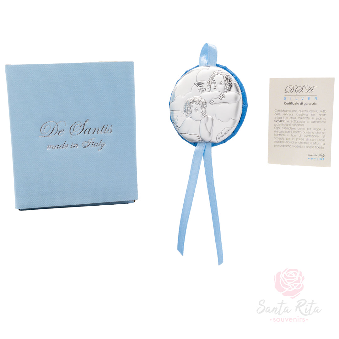 👶 La medaglia rotonda, in bilaminato argento e dal diametro di 5 cm, è completata da un elegante fiocco in raso celeste, pensato per essere appeso sopra la culla, al lettino o nella cameretta. Il design raffinato e la simbologia universale degli angeli lo rendono adatto sia ai maschietti che come dono neutro.