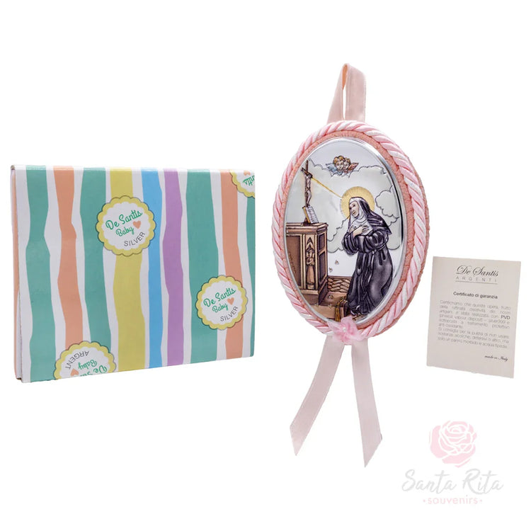 Adorabile sopraculla di Santa Rita con placca Argento 999 PVD rosa smaltato e carillon musicale. Protezione spirituale per neonati femminucce con finitura brillante protettiva. Melodia rilassante che accompagna il sonno sereno. ✨