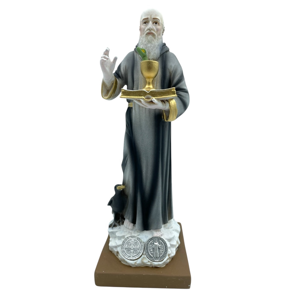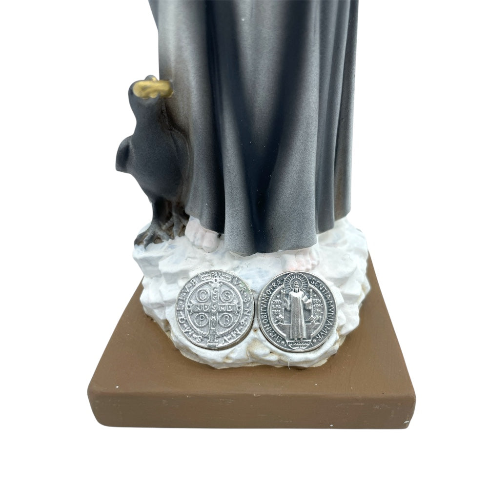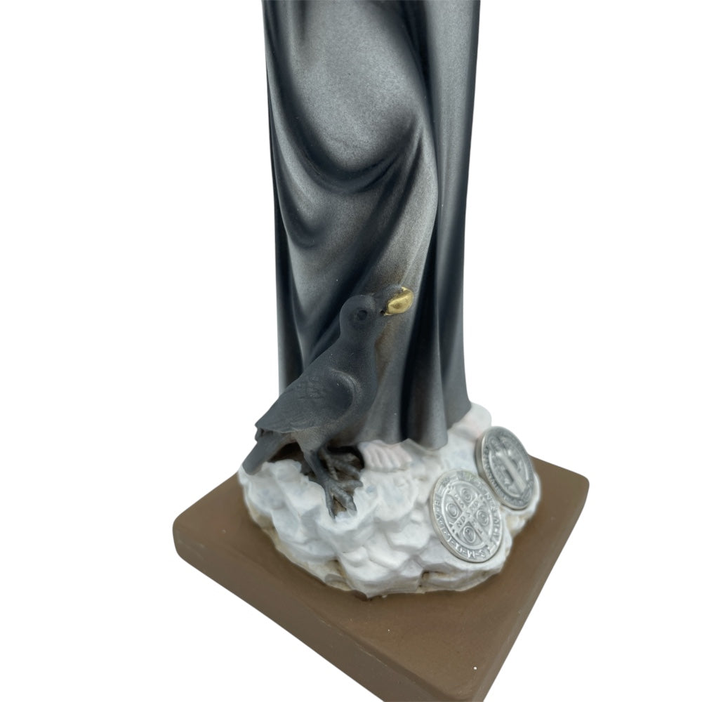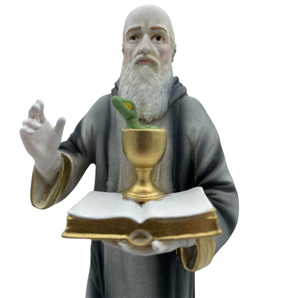 Statua di San Benedetto in resina dipinta a mano, padre del monachesimo occidentale e simbolo di pace e protezione spirituale.